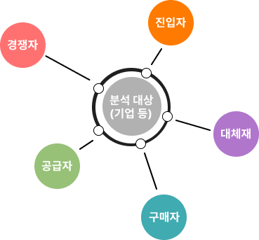 - 소비자의 구매력, 생산자의 구매력, 대체품에 대한 위험, 진입장벽이라는 요인을 통해 어떤 잠재적 경쟁자가 있는지에 대한 경쟁력 분석 도구