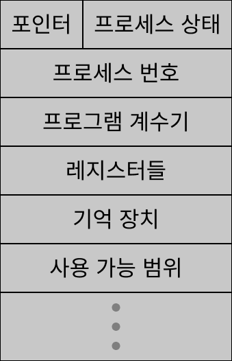 하나의 프로세스는 프로세스 제어블록(Process Control Block), 또는 작업 제어블록(Task Control Block)이라는 블록(Block, 컴퓨터 시스템안에서 정보를 저장하기 위해 기록한 물리적인 저장소)으로 관리 및 표현됩니다.