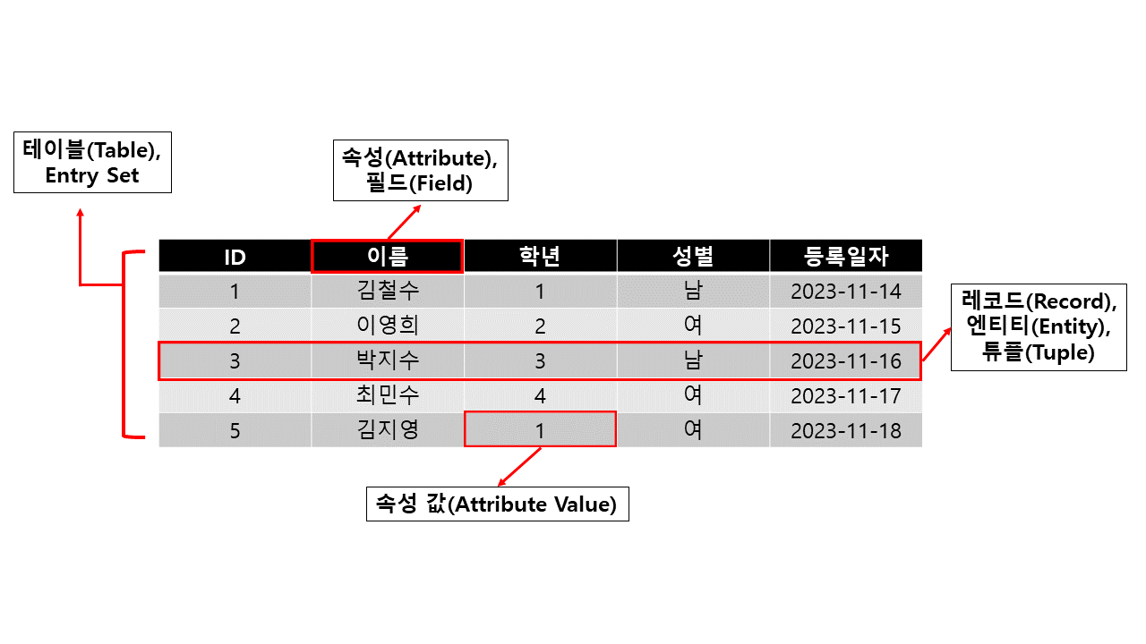 경우에 따라서는 속성을 열 또는 칼럼(Column)이라고 칭하기도 합니다.