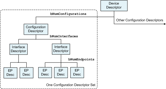 USB 디스크립터(Descriptor)는 계층형 구조를 가지고 있으며, 제조 단계에서 함께 탑재 되어 출고 되는 것이 일반적이므로 응용프로그래머가 별도로 개발할 일은 거의 없습니다.