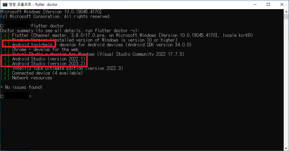 만약, 아래의 항목 중 오류가 있더라도 [Android Studio]와 [Android toolchain] 목록이 정상이라면
