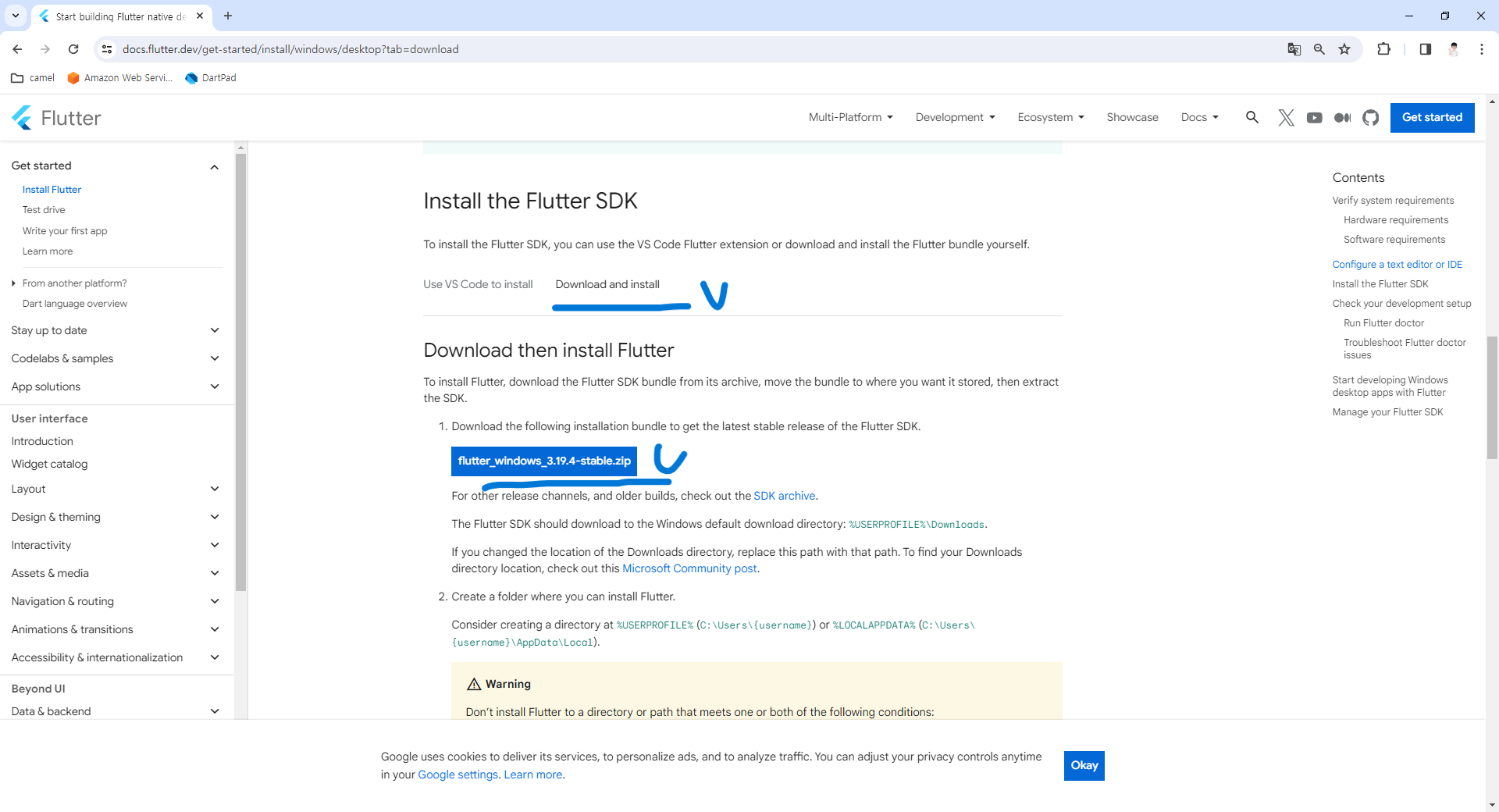 Flutter는 아래의 사이트에서 SDK를 다운로드할 수 있습니다.