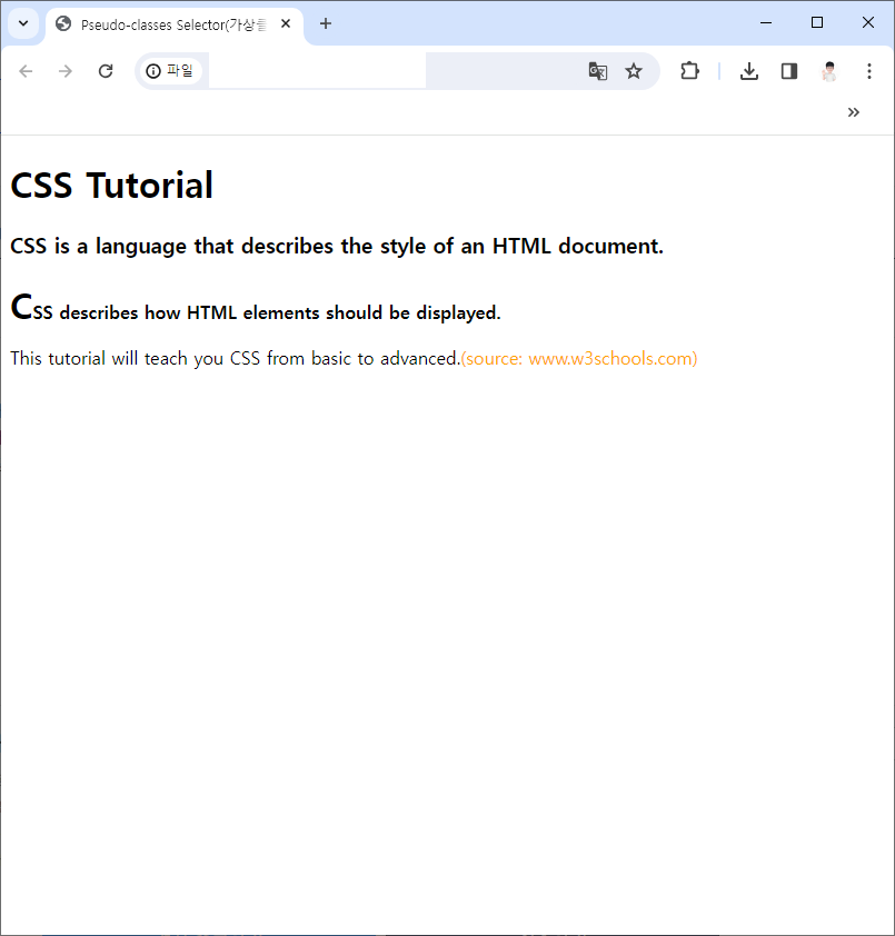 | ::first-letter | 지정된 요소의 첫 번째 문자 선택 | 1 |