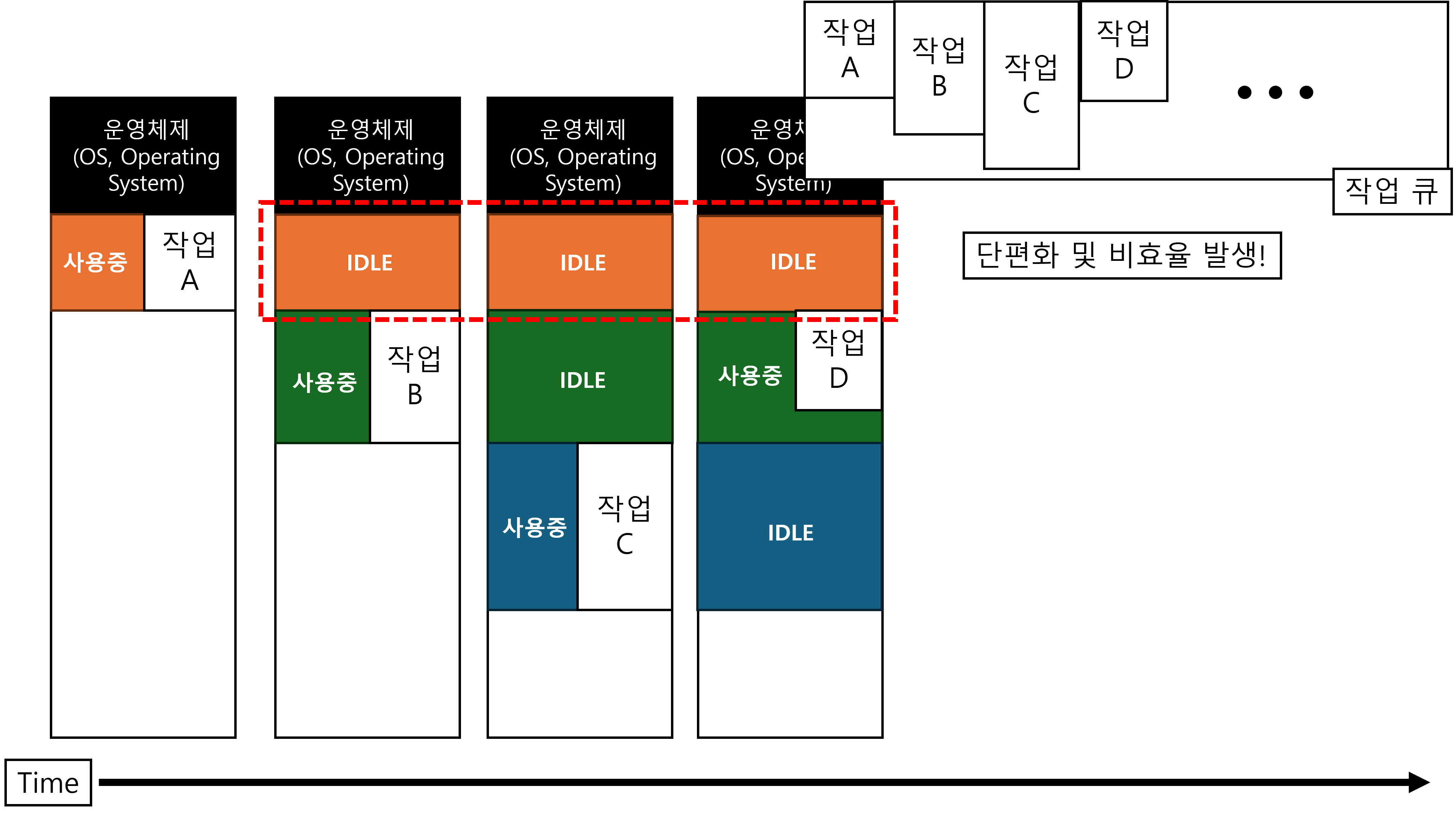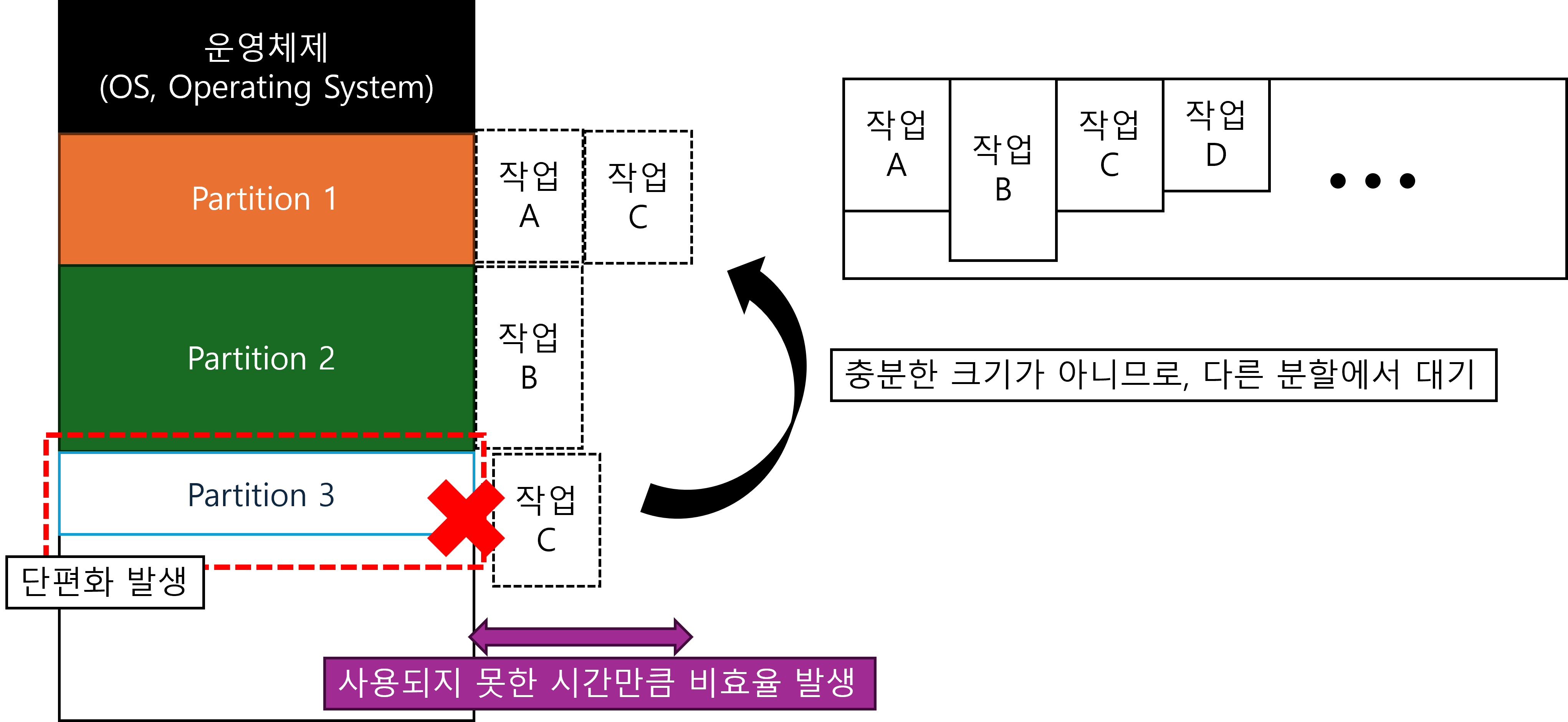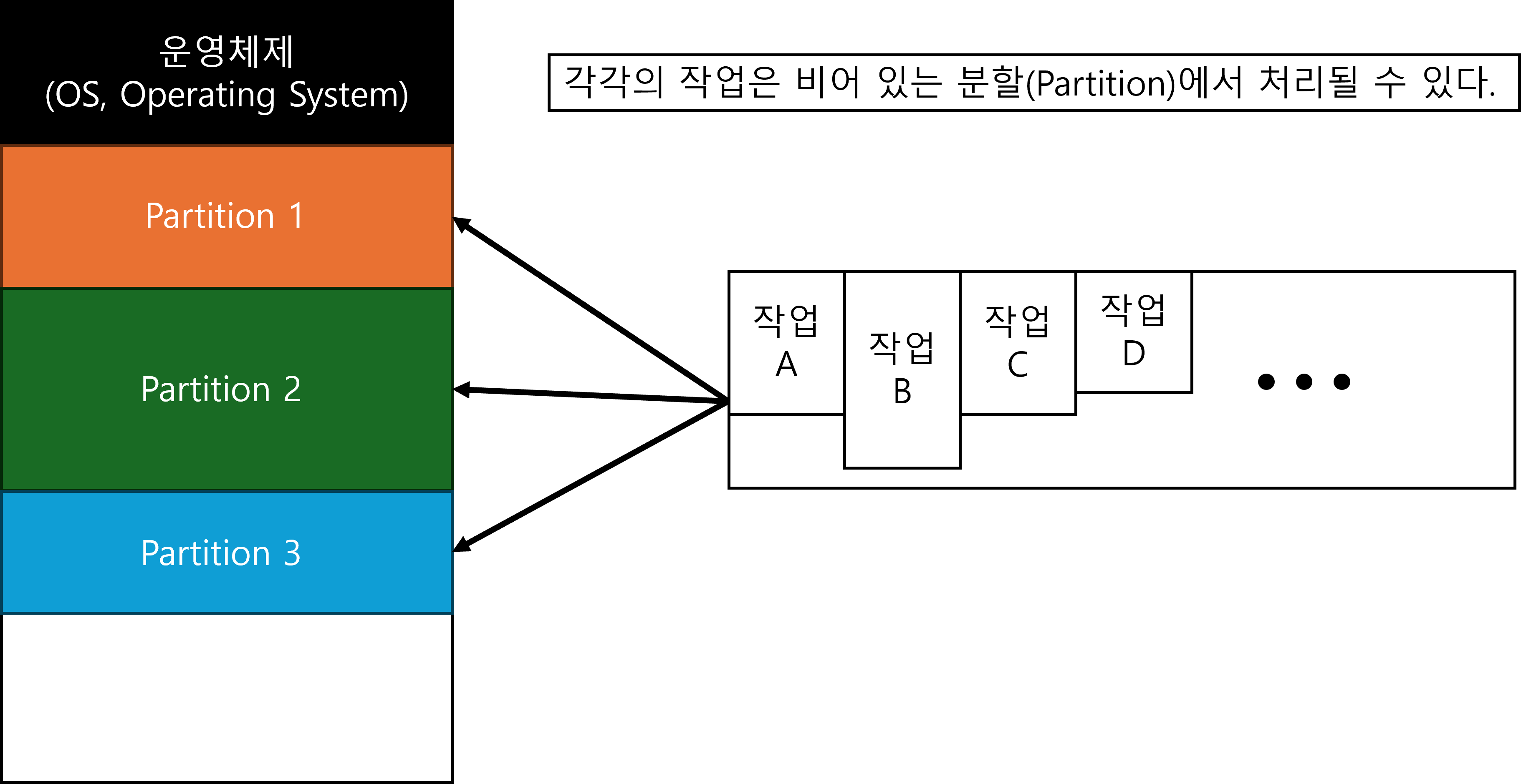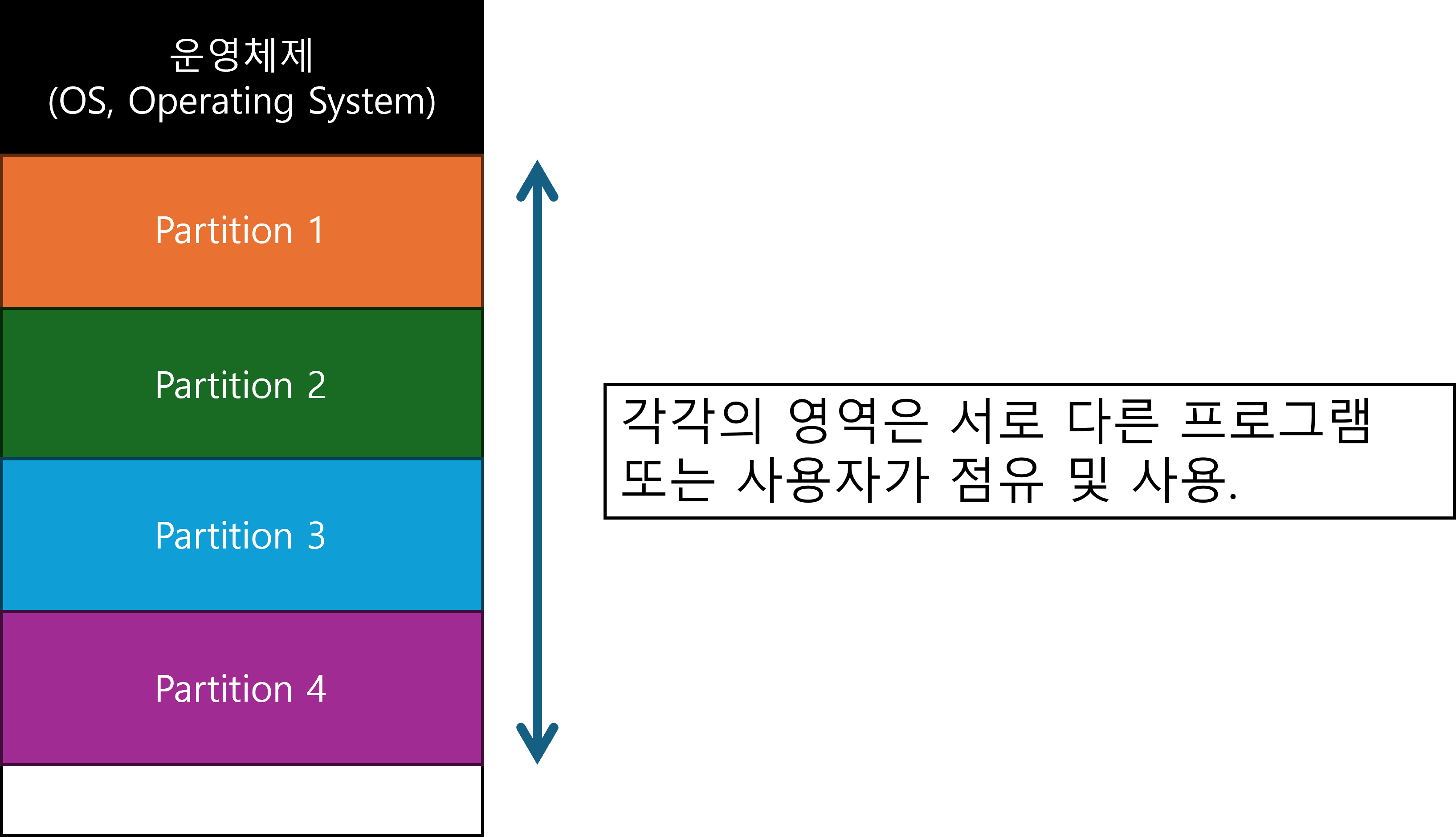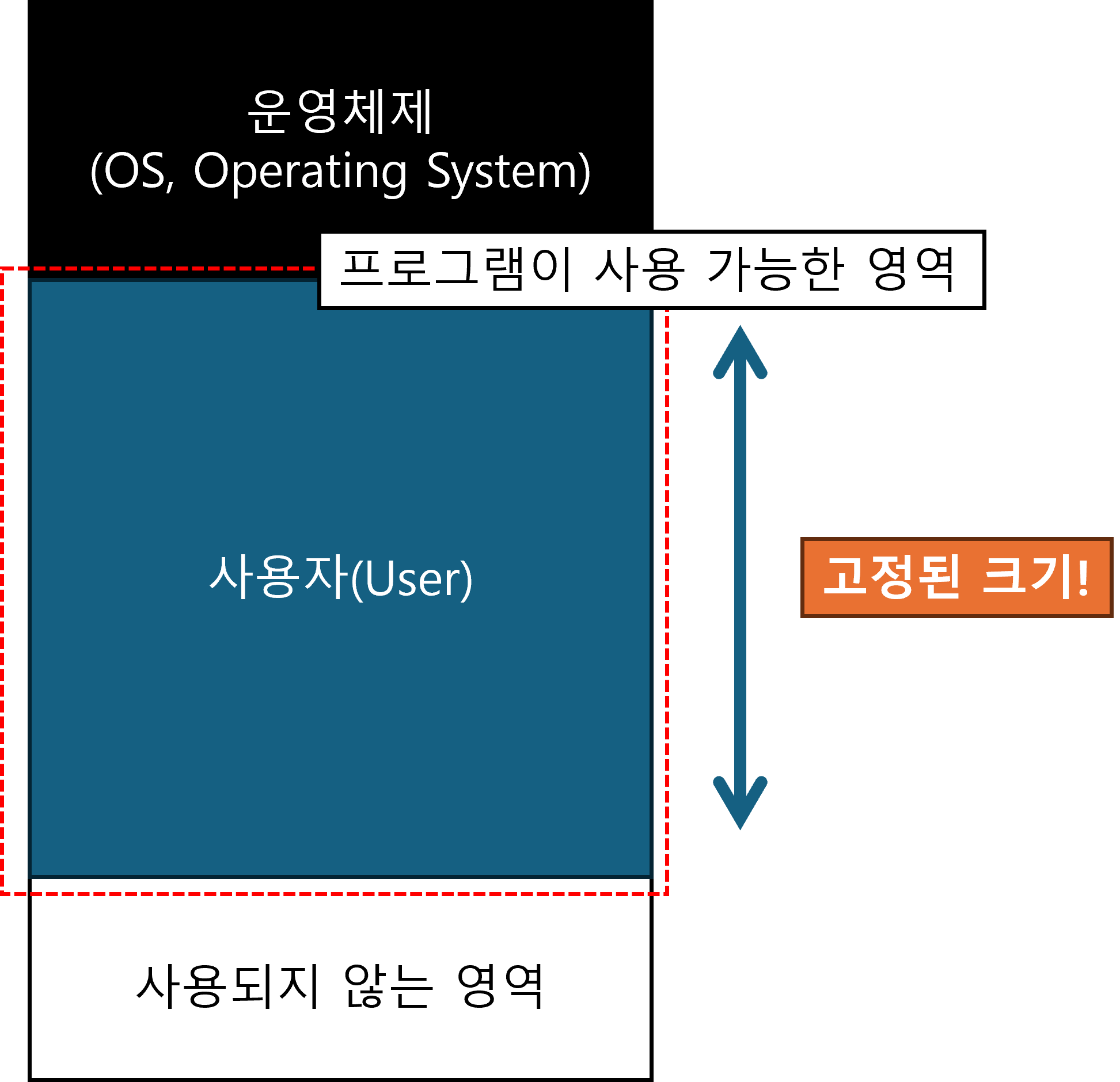하지만, 이렇게 메모리의 할당이 간단하는 의미는 곧 단위 시간당 사용 가능한 프로그램 또는 사용자의 수가 가장 적고 한 번에 한 개의 작업 또는 사용자만 컴퓨터의 자원을 점유할 수 있기 때문에 굉장히 비효율적인 관리 전략이 됩니다.