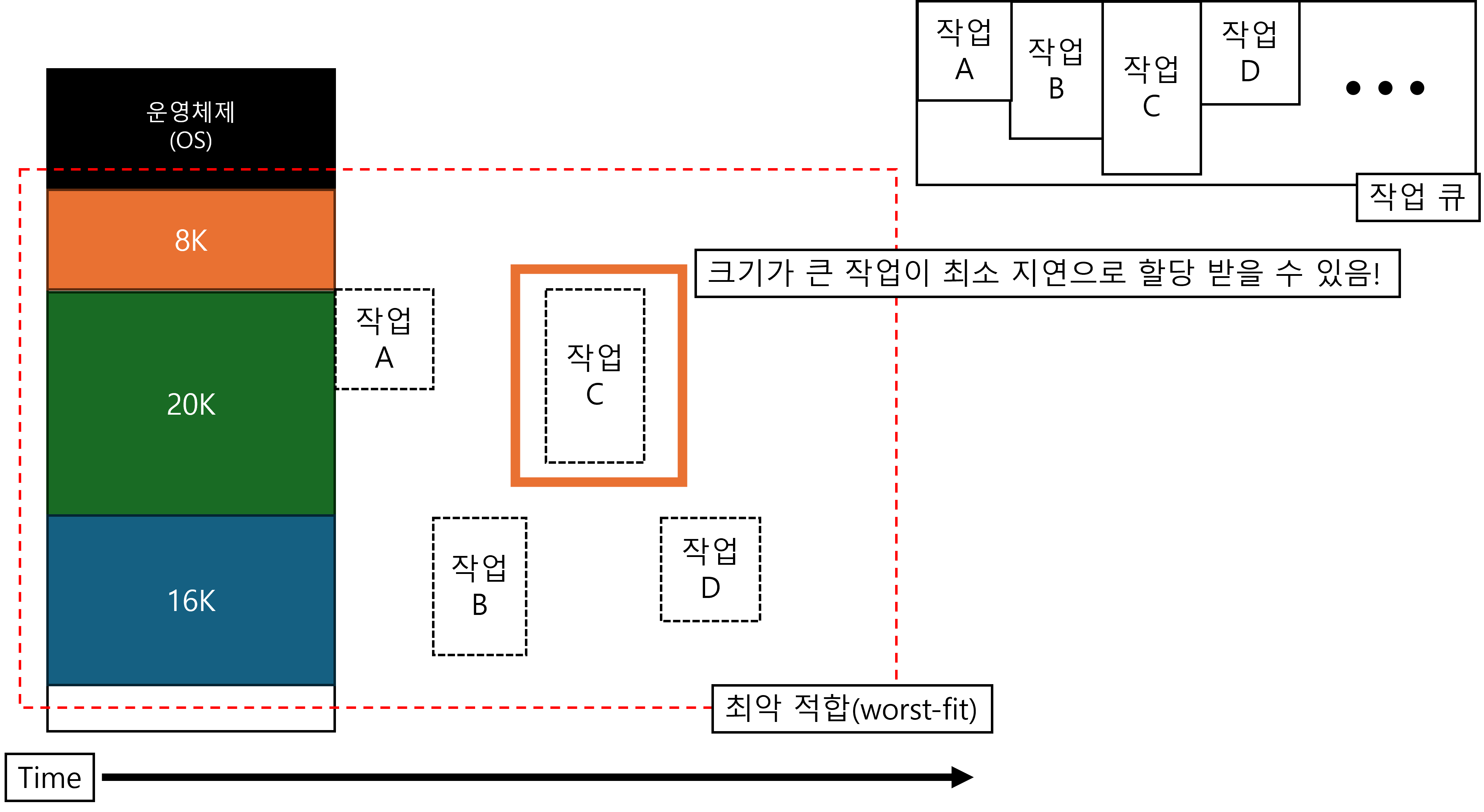최악 적합(worst-fit)은 프로그램이나 데이터를 주 기억장치의 사용 가능한 공간 중에서