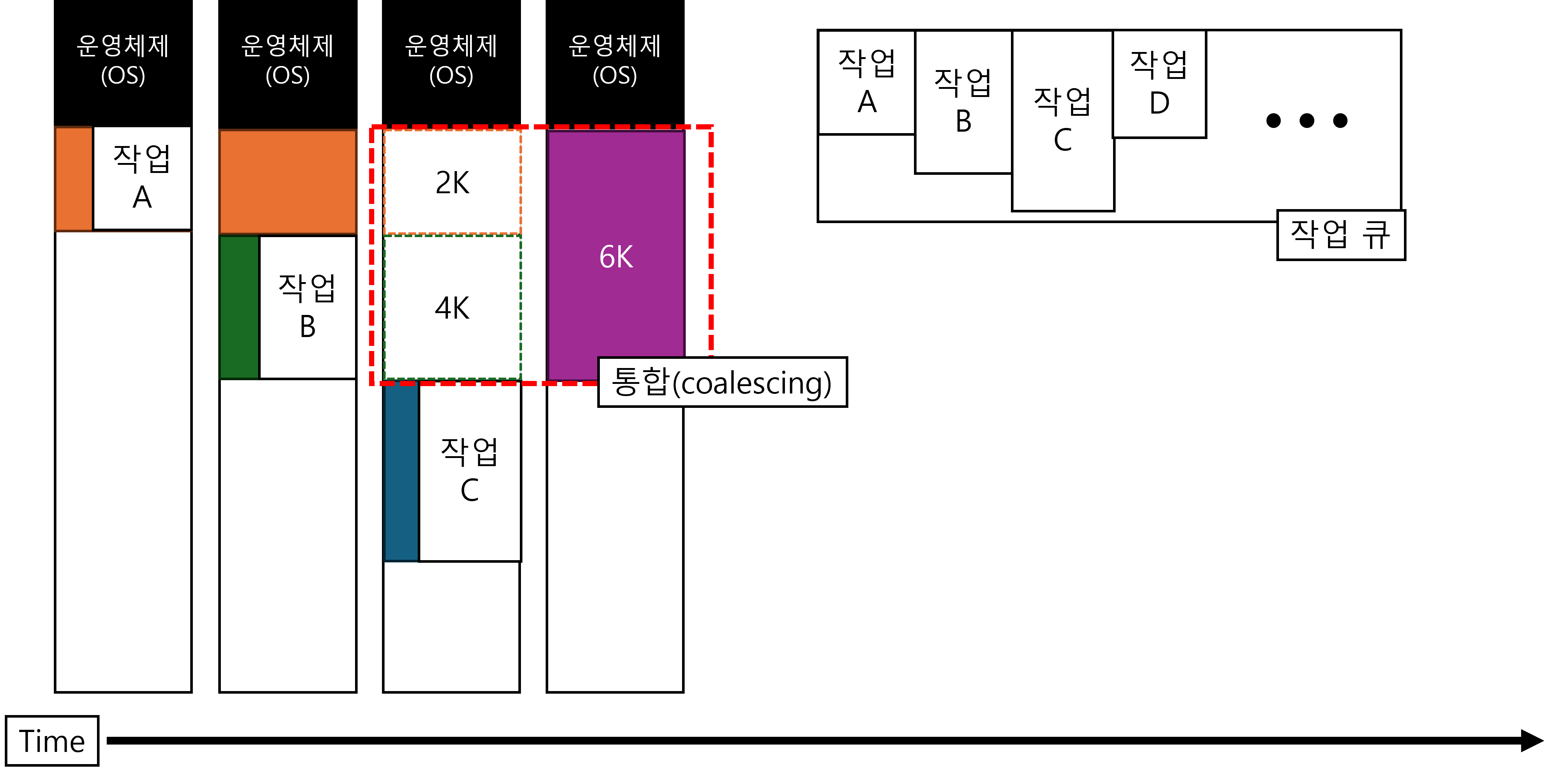 잉여분의 기억 장치를 인접한 분할끼리 합쳐서 큰 작업이 할당되어 사용할 수 있도록 하였습니다.
