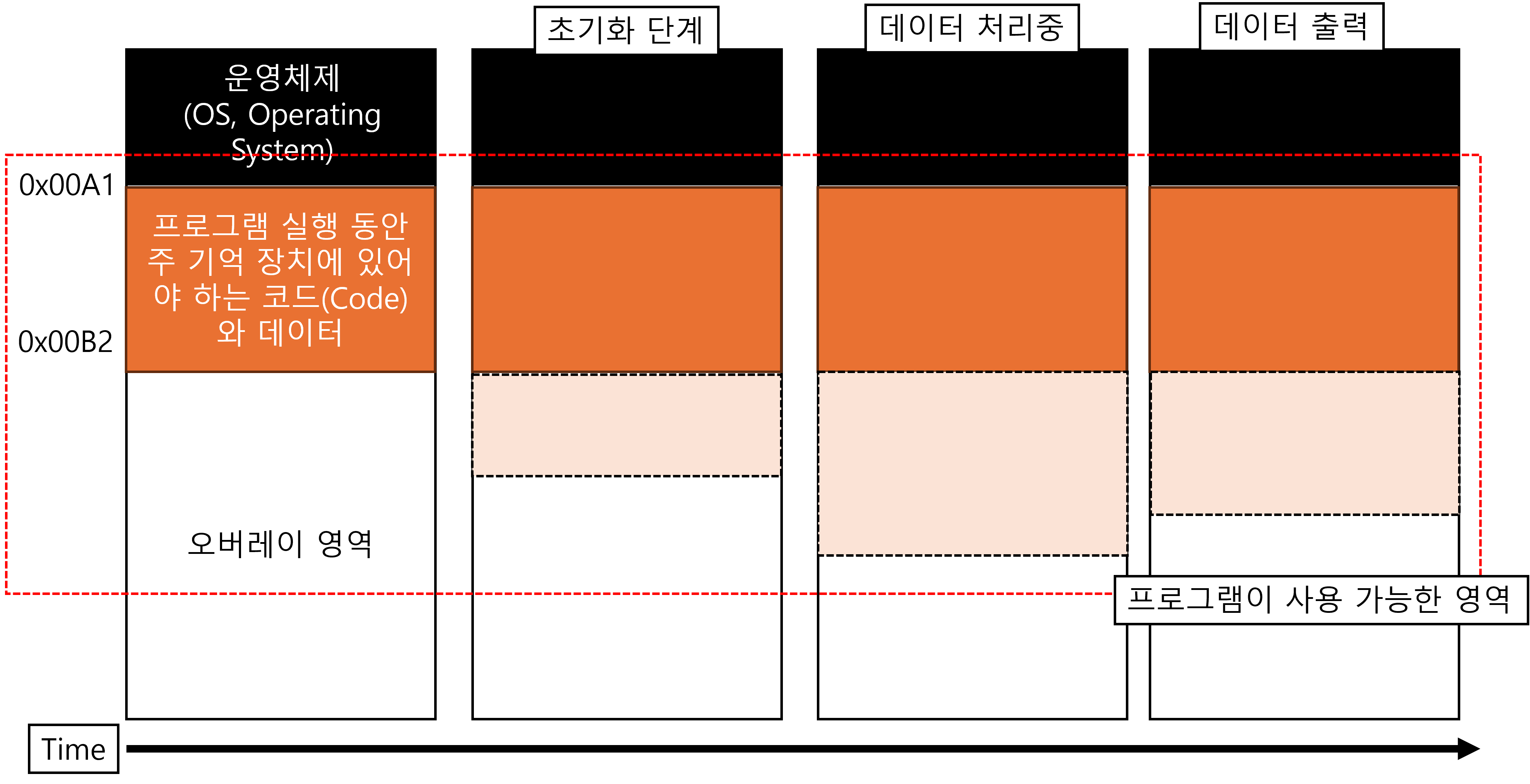 이 경우, 아래와 같이 오버레이(overlay) 기법을 사용하면 주 기억장치 용량보다 큰 프로그램을 수행할 수 있습니다.