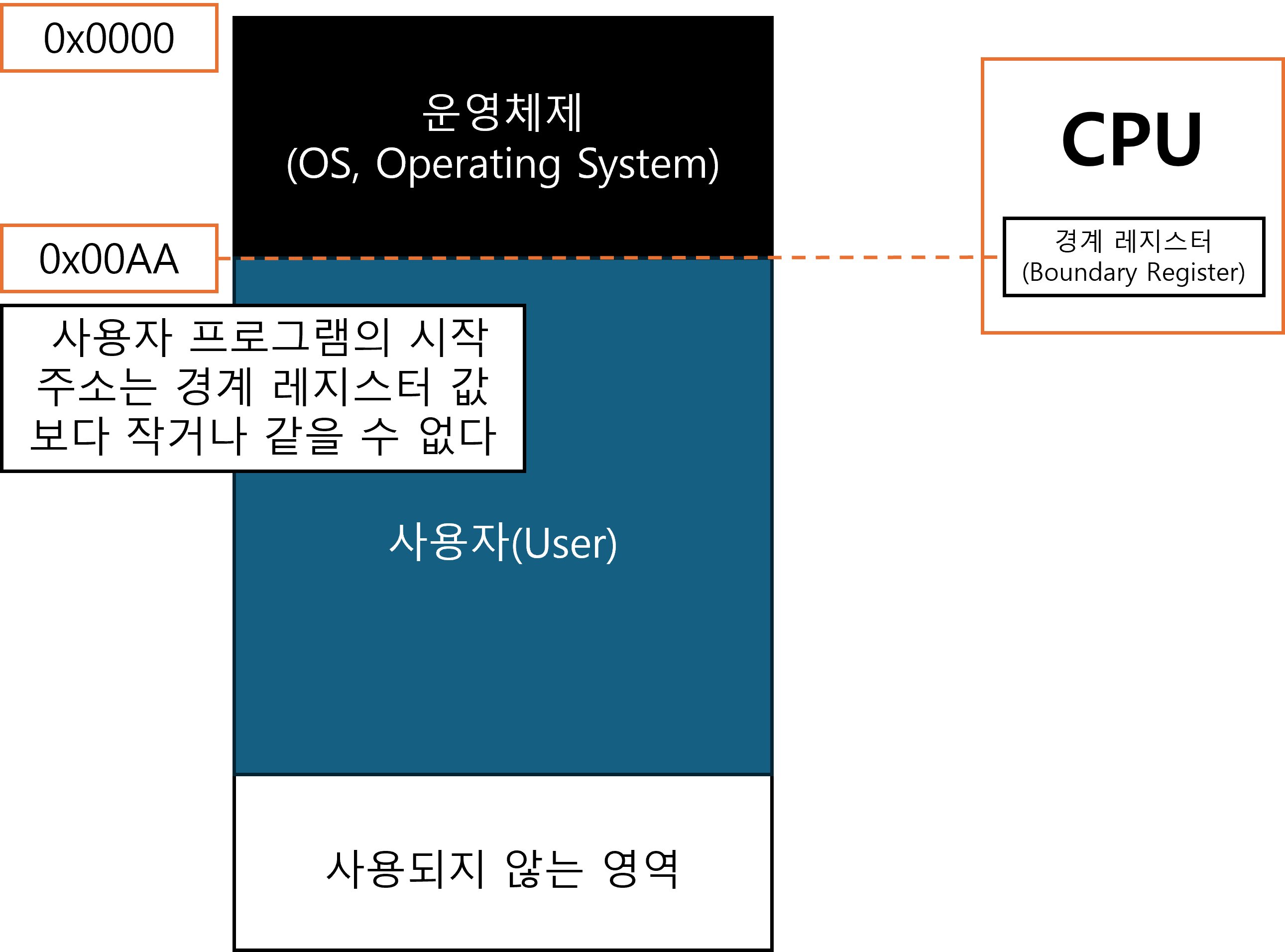 CPU 내의 하나의 경계 레지스터를 두어 운영체제가 위치하는 가장 마지막 주소 부분을 기억하도록 하였는데,