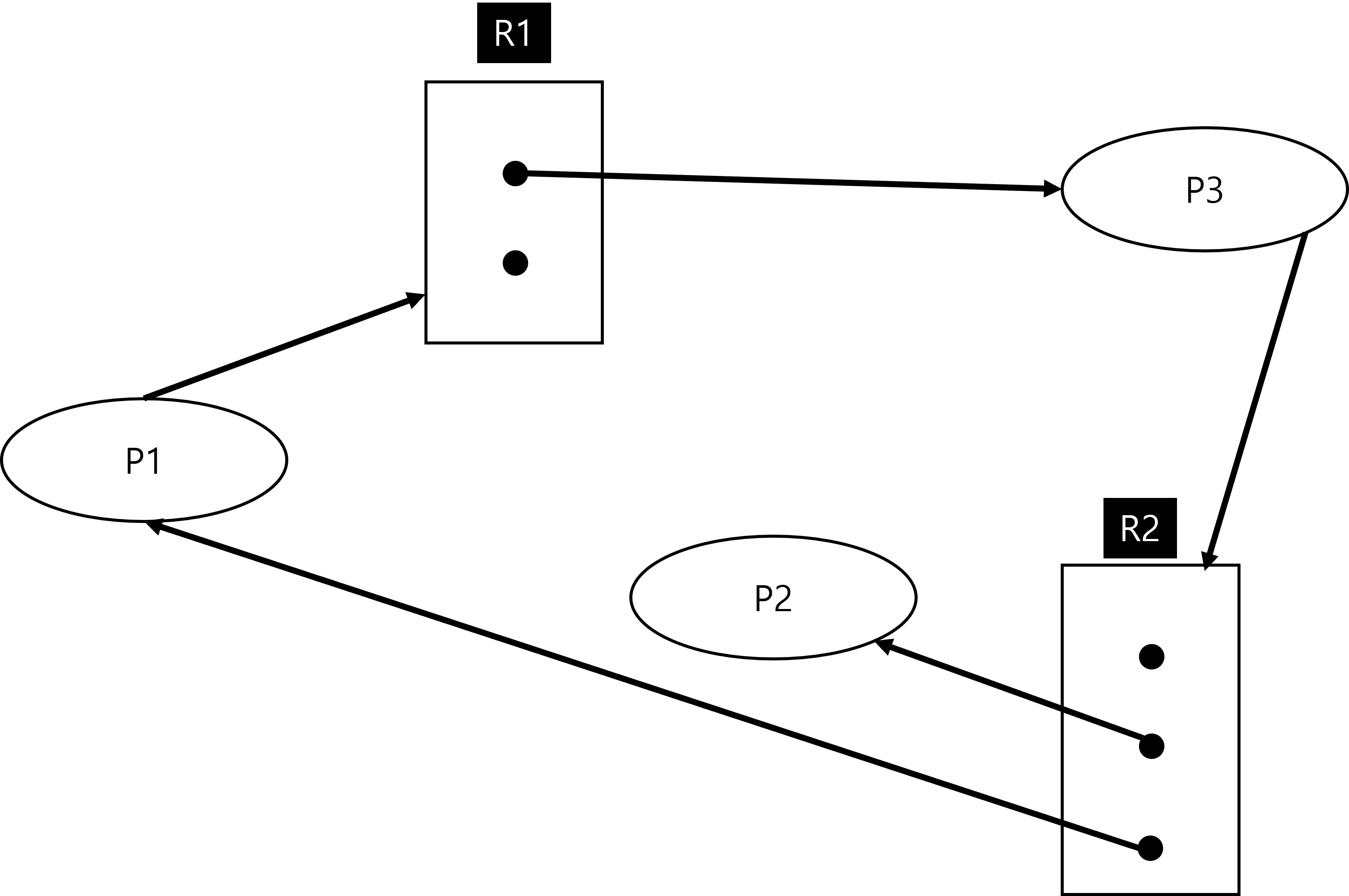 위 그림에서는 P1과 P3간에 사이클이 보이고 있지만, r1원 자원 그룹의 경우 전체 자원의 개수는 총 2개 이므로 p2가 작업을 마치게 되면 p1은 r1을 할당 받아서 교착상태는 해소될 수 있습니다. 또는 p4가 작업을 끝마치면 p3는 r2를 할당 받아서 교착상태가 해소될 수 있습니다.