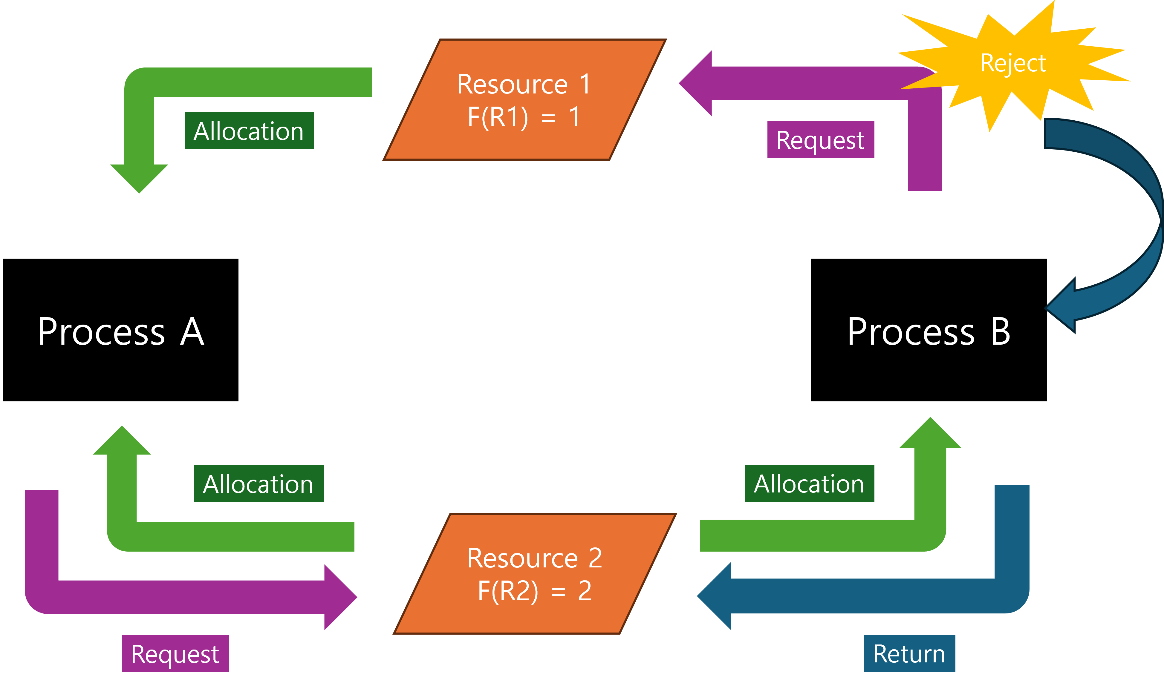 반면에, 프로세스 B는 자원 2를 소유하고 있었으므로 F(자원2) > F(자원1) 는 만족되지 않기 때문에 프로세스 B는 점유하던 자원 2를 반환하게 됩니다.
