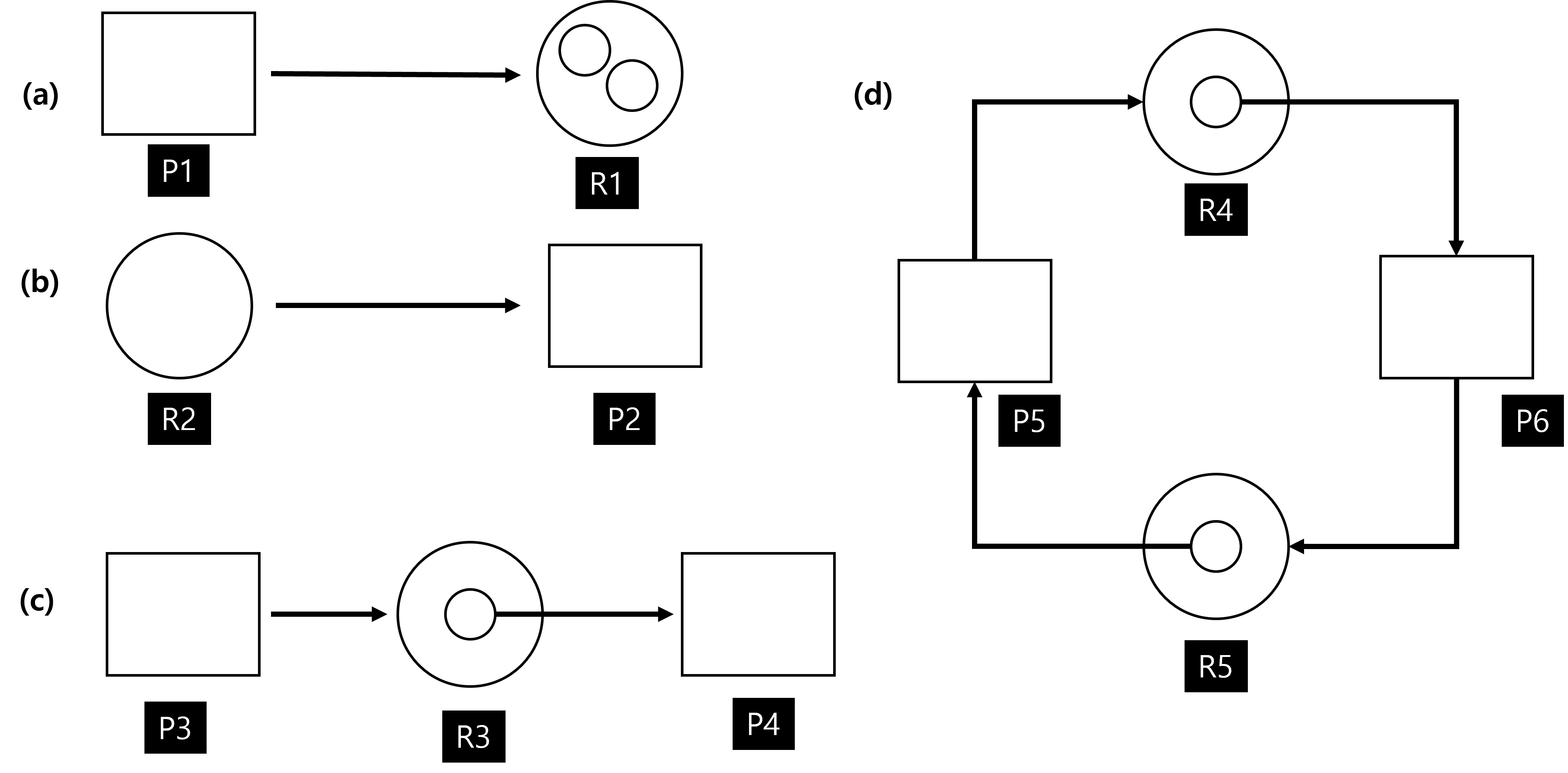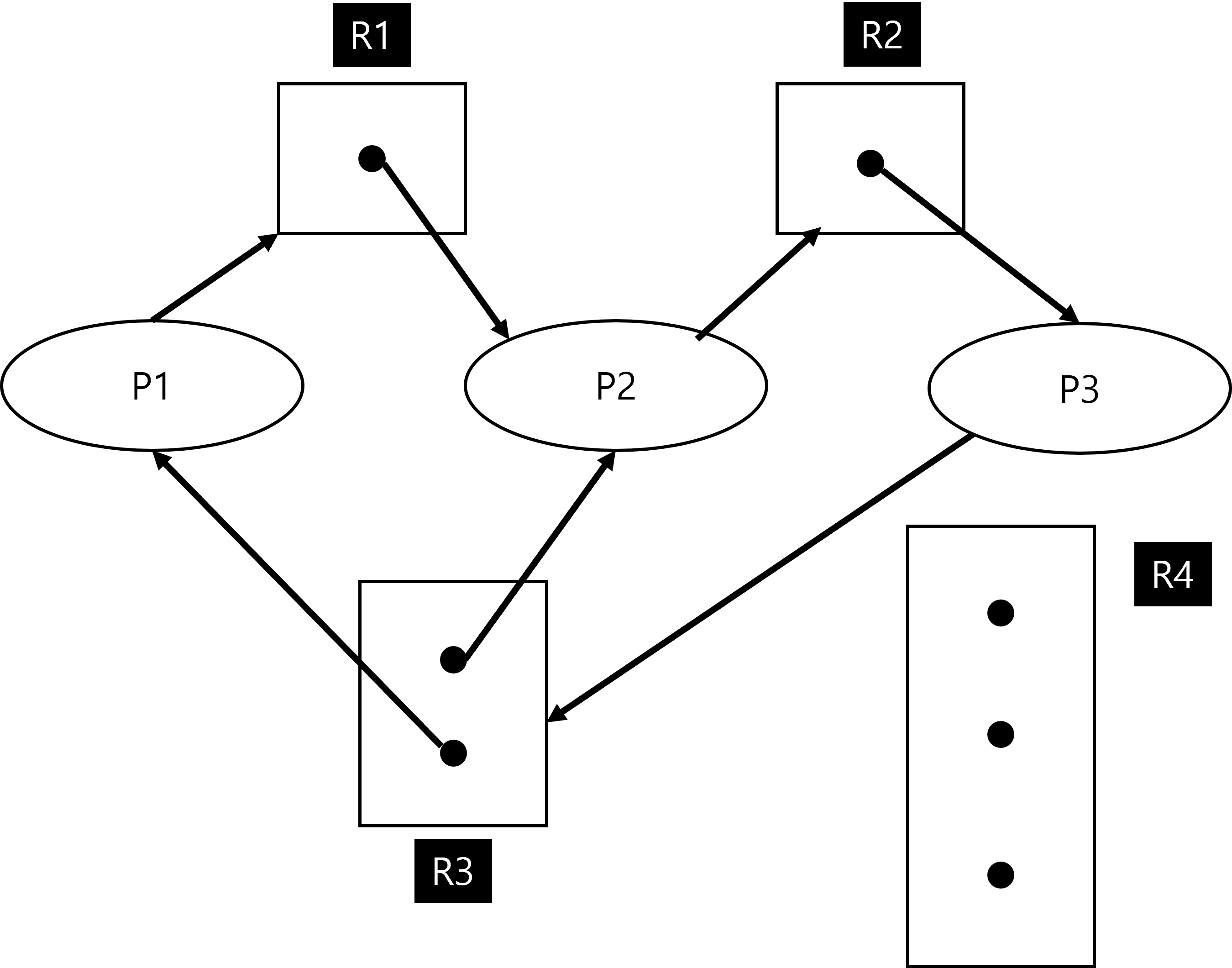 위 그림에서 사각형은 프로세스를 가리키고, 원은 동일한 자원의 집합을 나타내며, 큰 원 안에 그려진 작은 원은 해당 자원의 분류에 속하는 동일한 자원들을 의미합니다.