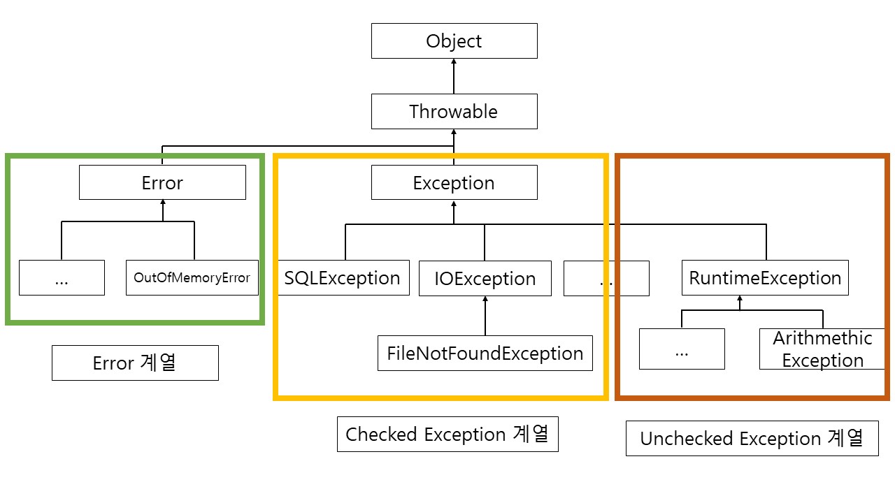 자바에서 예외는 Throwable 클래스를 상속받습니다. 형제 클래스로써 Error 클래스가 있으며 Error 클래스를 상속받는 클래스들을 Error 계열, Exception을 상속받는 클래스를 Exception 계열이라고 합니다. Exception은 다시 두 가지로 나뉘는데 컴파일 수준에서 바로 감지가 가능한 Checked Exception 계열과 프로그램을 실행시켜 봐야 알 수 있는 Unchecked Exception 계열로 나눌 수 있습니다. Checked Exception은 예외에 대한 대처 코드가 없으면 컴파일이 진행되지 않아 컴파일 오류로 검출되고, Unchecked Exception은 예외에 대한 대처 코드가 없더라도 일단 컴파일을 진행되어 프로그램 실행 후 프로그램이 종료되면서 오류 코드와 함께 검출됩니다.