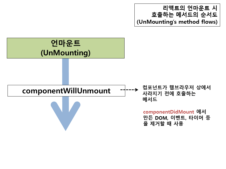 언마운트는 리액트 컴포넌트가 화면에서 사라질 경우 거치는 단계로 이 단계를 거치면 리액트 컴포넌트의 라이프 사이클은 종료 됩니다.