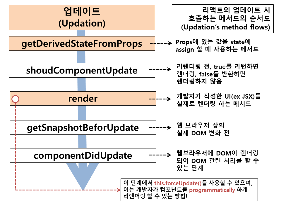 업데이트는 컴포넌트의 input 상자에 값이 바뀐다거나, 클릭 이벤트로 리렌더링 하는 등의 경우에 거치는 단계로, 컴포넌트가 화면에서 완전히 사라진 것이 아니면 데이터가 바뀌거나 입력값을 받는 등 거의 대부분의 상호 작용에 대응할 수 있기 때문에 리액트의 컴포넌트 생애 주기 중에서 가장 많은 시간을 점유하는 단계 입니다.