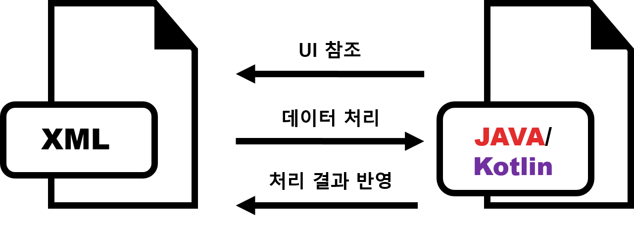 안드로이드에서 앱은 xml을 기반으로 하여 화면을 설계하고, Java나 Kotlin 소스 코드를 통해 필요한 로직을 구현하고 앱의 동작을 만들어낼 수 있습니다.