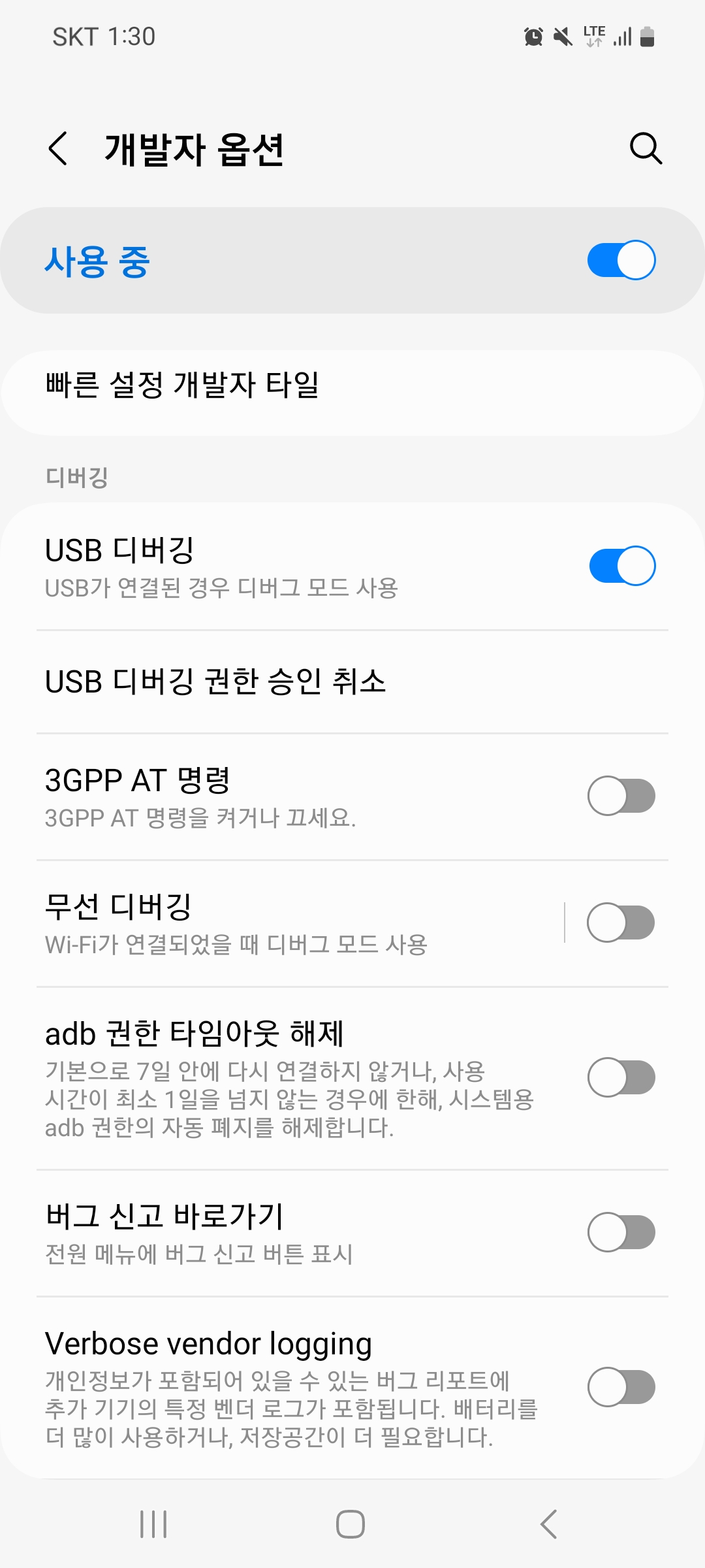 이 설정을 켜두지 않으면 유선이나 무선으로 앱을 설치하고 디버깅 할 수 없으므로 잘 체크해야 한다.
