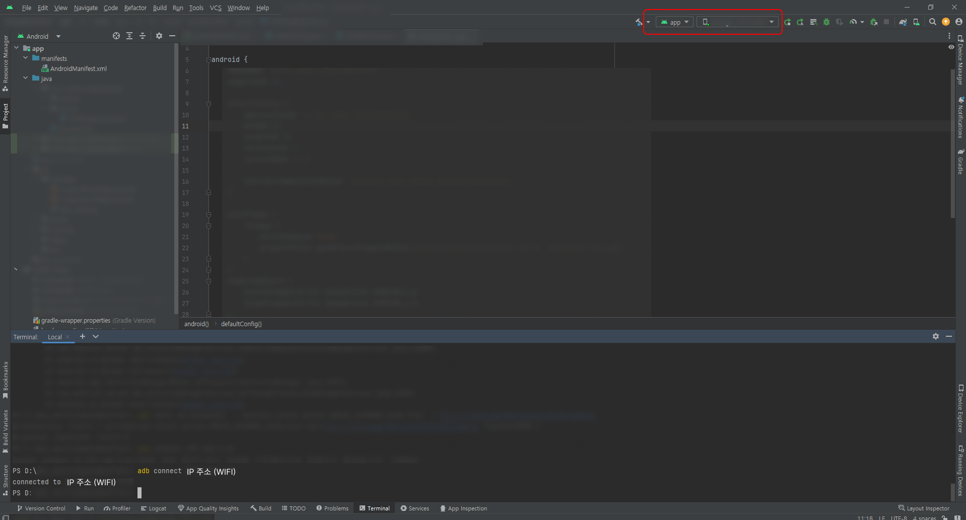 아래와 같이 안드로이드 스튜디오에서 디바이스가 원격으로 잘 접속된 것을 확인할 수 있다.
