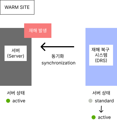 | 웜 사이트(Warm Site) | - Hot Site와 유사하나 재해복구센터에 주 센 터와 동일한 수준의 자원을 보유하는 대신 중요성이 높은 자원만 부분적으로 재해복구센터에 보유하고 있는 센터 - 데이터 백업 주기가 수 시간 ~ 1일 - 재해 발생 시 복구까지의 소요시간(RTO)은 수일 ~ 수주 |