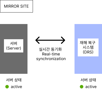 | 미러 사이트(Mirror Site) | - 주 센터와 데이터복구센터 모두 운영 상태로 실시간 동시 서비스가 가능한 재해 복구 센터 - 재해 발생 시 복구까지의 소요 시간(RTO)은 즉시(이론적으로 0) |