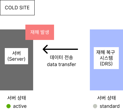 | 콜드 사이트(Cold Site) | - 데이터만 원격지에 보관하고, 재해 시 데이터를 근간으로 필요 자원을 조달하여 복구할 수 있는 재해복구센터 - 재해 발생 시 복구까지의 소요 시간(RTO)은 수주~수개월 - 구축 비용이 저렴하나 복구 소요시간이 길고 신뢰성이 낮음 |